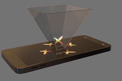 El primero es una pirámide holográfica para teléfonos inteligentes, que es de tamaño muy pequeño y se coloca en la pantalla del teléfono inteligente para reflejar la luz emitida por la pantalla para generar un holograma.