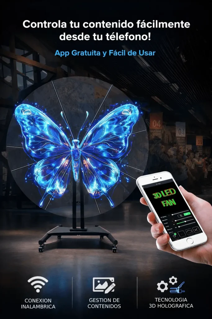 Sorprende con la tecnología de Ventiladores LED 3D de 180cm. Imágenes en Ultra HD que levitan en el aire con un brillo de 2500 nits, visibles incluso a plena luz del día.